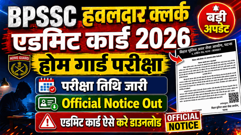 बहुत से उम्मीदवार इसे गूगल पर “BPSSC Hawaldar Clerk Admit Card 2026”, “Home Guard Admit Card 2026 Bihar”, “BPSSC Home Guard Clerk Exam Date 2026” या “Bihar Police Home Guard Admit Card 2026” जैसे कीवर्ड से सर्च कर रहे हैं। ऐसे में यह आर्टिकल आपके लिए बहुत उपयोगी रहेगा, क्योंकि यहां आपको पूरी जानकारी सरल हिंदी में दी जा रही है।