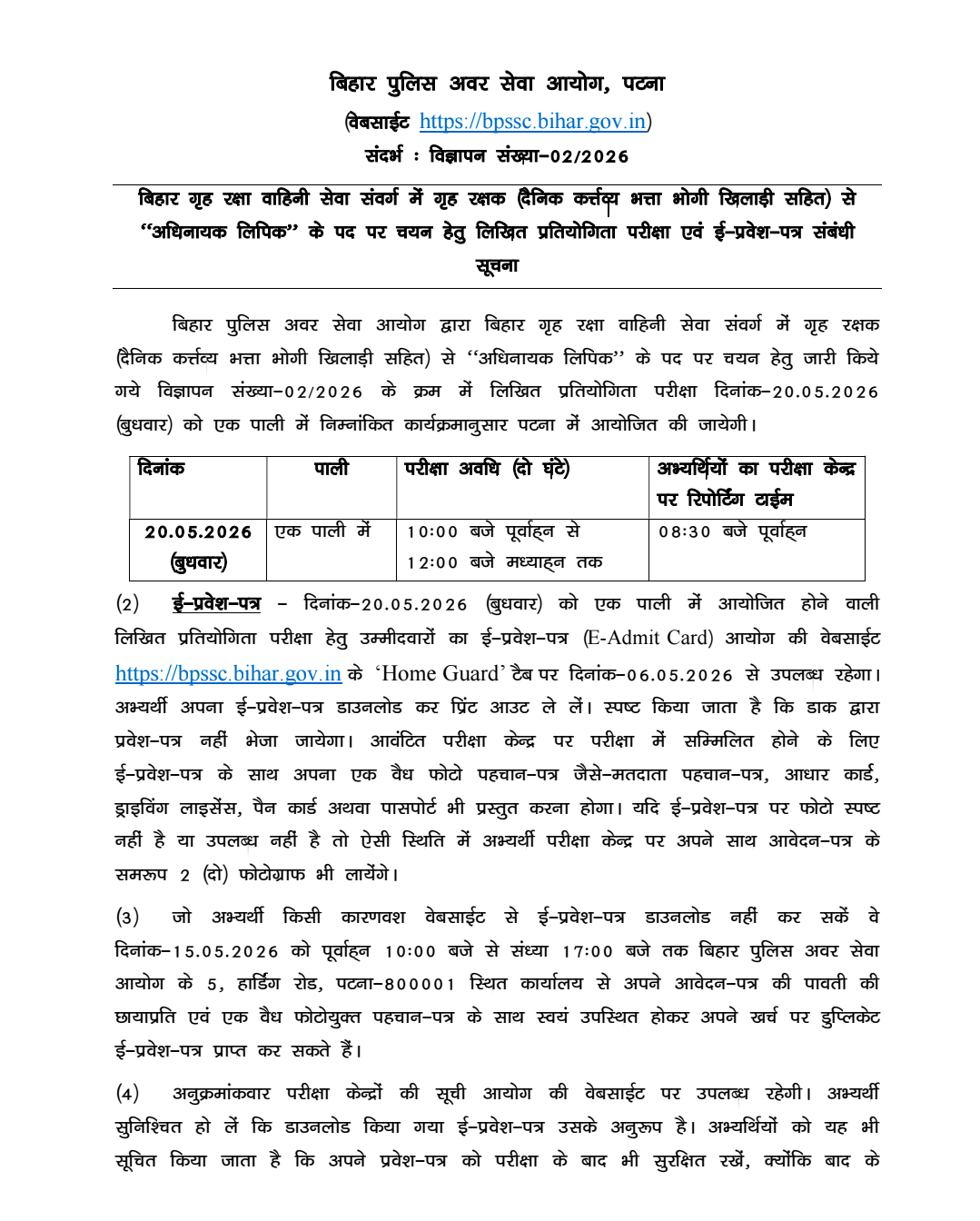 बिहार पुलिस अवर सेवा आयोग की ओर से जारी नोटिस के अनुसार, विज्ञापन संख्या 02/2026 के अंतर्गत गृह रक्षक (दैनिक कर्तव्य भत्ता भोगी खिलाड़ी सहित) से अधिनायक लिपिक पद के लिए लिखित परीक्षा आयोजित की जाएगी।